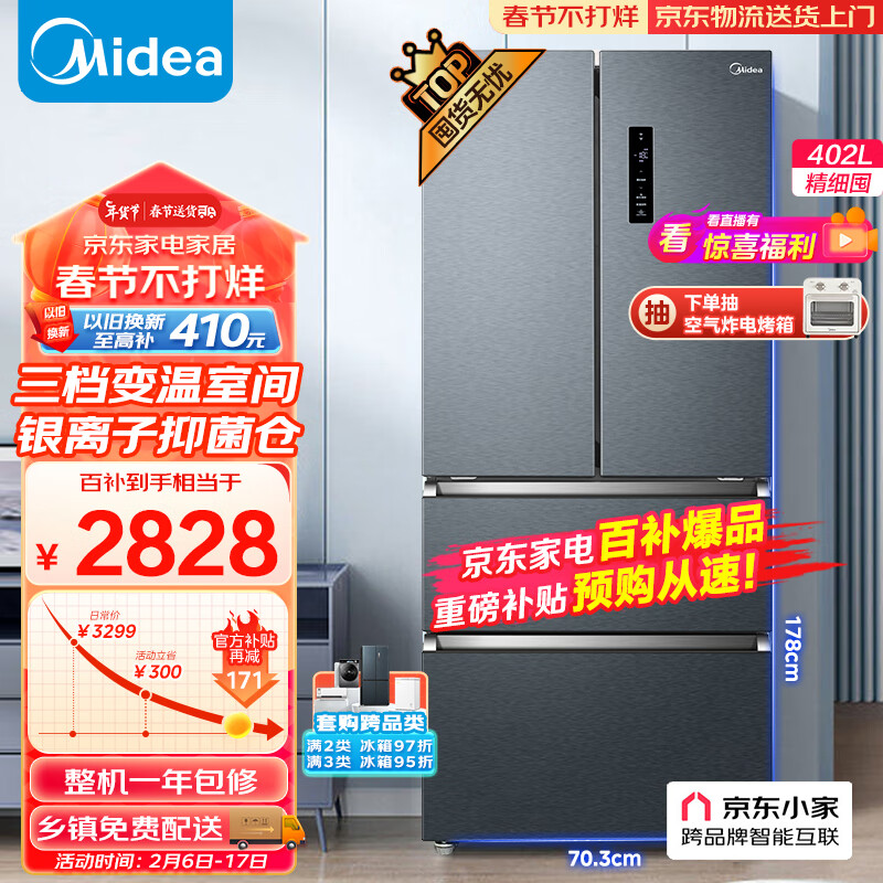 美的(Midea)402升多门冰箱法式四开门一级能效超薄智能无霜家用大容量电冰箱BCD-402WFPZM(E)价格:2828.00元!