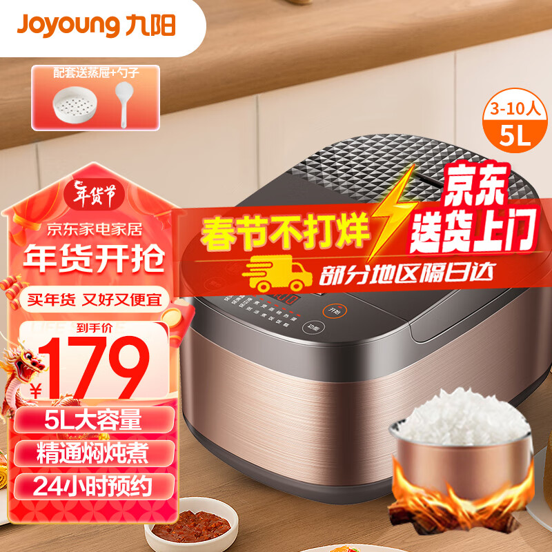 九阳(Joyoung)5升3~10人电饭煲电饭锅智能预约多功能大功率加热五层厚釜不粘黄晶内胆年货送长辈送老人50FZ810价格:179.00元!