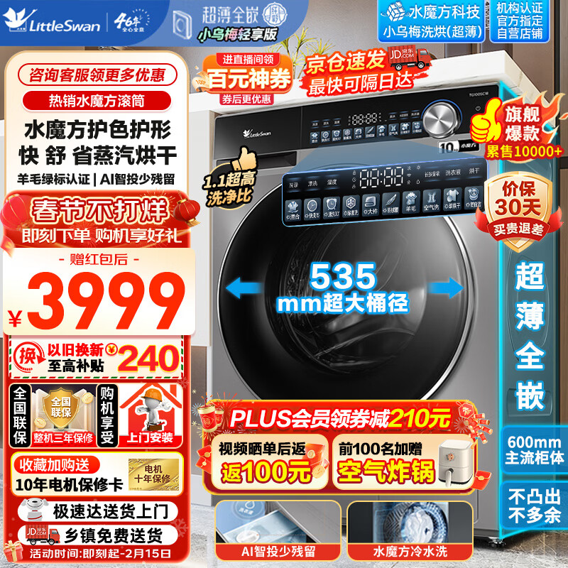 小天鹅(LittleSwan)洗衣机全自动家用洗烘一体10公斤滚筒水魔方小乌梅轻享版超薄全嵌智能投放大筒径SC18价格:3999.00元!