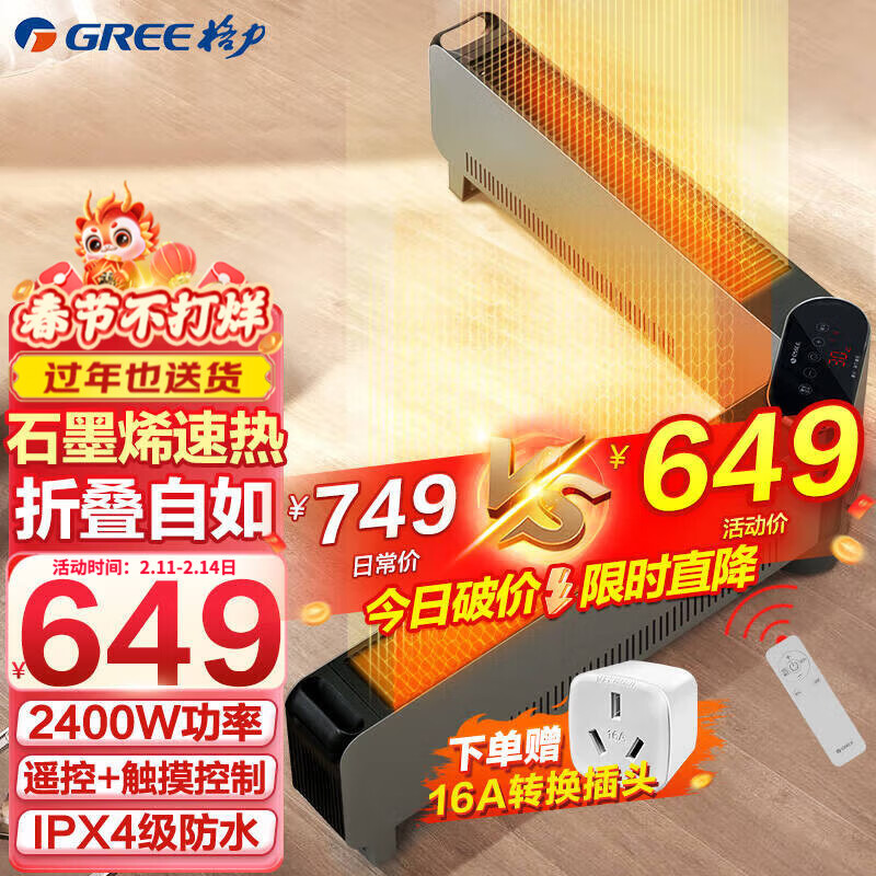 格力(GREE) 石墨烯折叠踢脚线取暖器家用远程遥控IPX4级防水电暖气片家用大面积速热移动地暖风机 1.2米石墨烯2400W款NJE-S6024Ba价格:648.00元!
