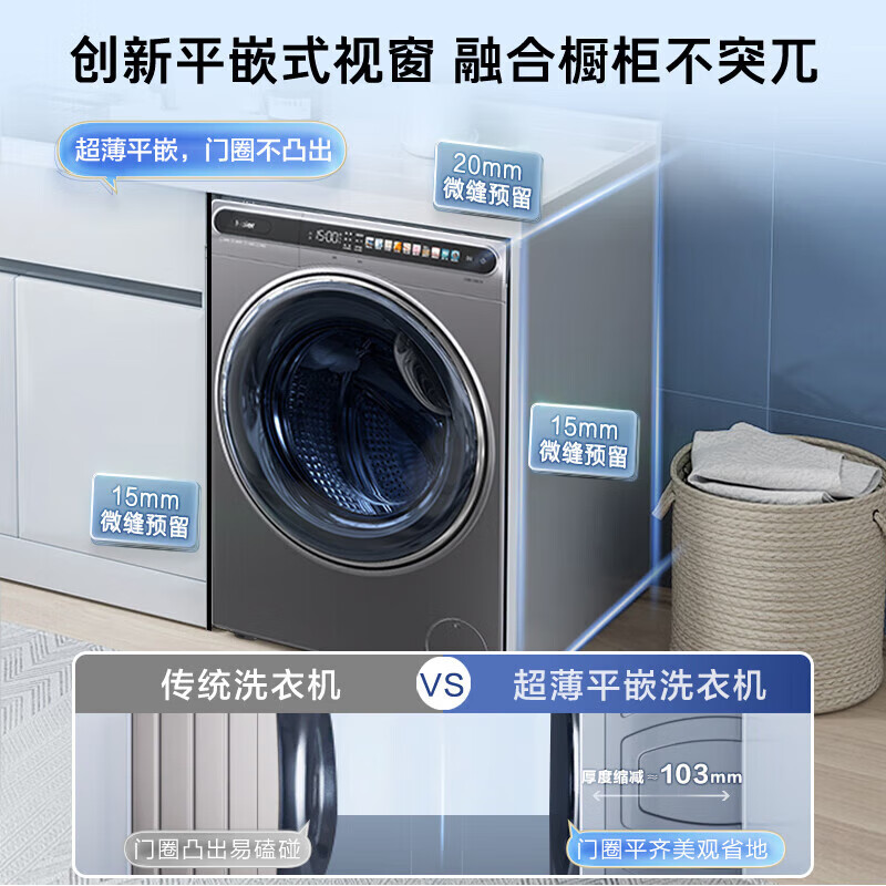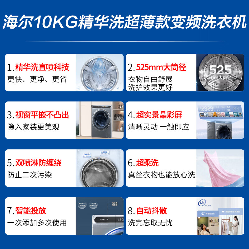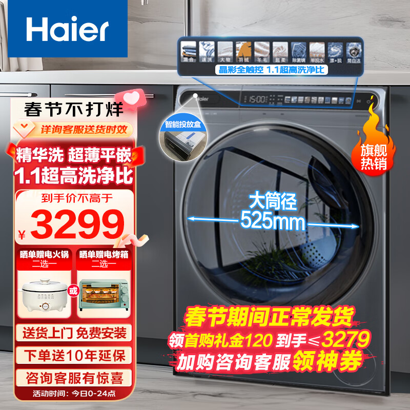 海尔(Haier)【精华洗】10KG滚筒洗衣机全自动家用大容量变频525大筒径超薄平嵌智能投放EG100MATESL59S[家电]价格:3399.00元!