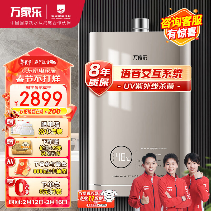 万家乐18升 燃气热水器四驱增压零冷水天然气语音无线分控AI智能节能紫外线杀菌阻垢净滤芯JSQ34-18RL11价格:2899.00元!
