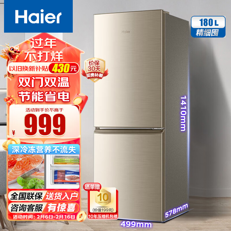 海尔(Haier)冰箱 180升小型家用宿舍租房家电双门小冰箱 省电节能直冷迷你两门电冰箱 公寓适用价格:999.00元!