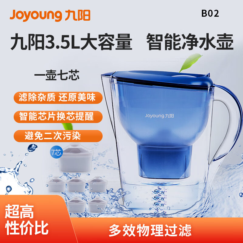 九阳(Joyoung)净水壶(1壶7芯套装)家用滤水壶 过滤净水器 B02(A)3.5L价格:189.00元!