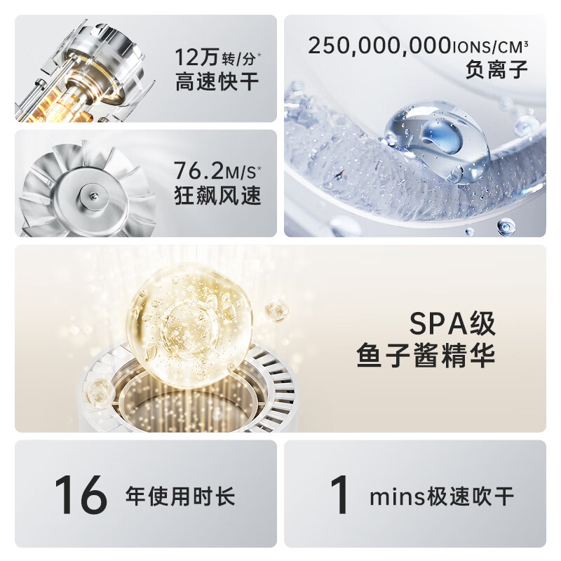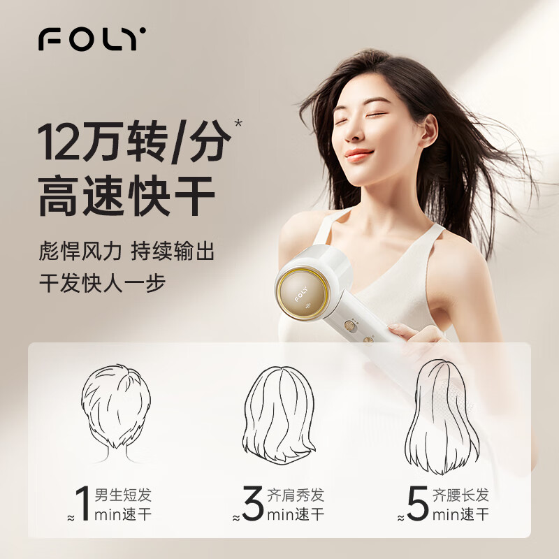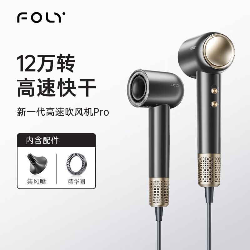 FOLY鱼子酱吹风机负离子高速电吹风大功率护发家用无叶吹风机速干低噪音便携式风筒PRO 灰金色价格:329.00元!