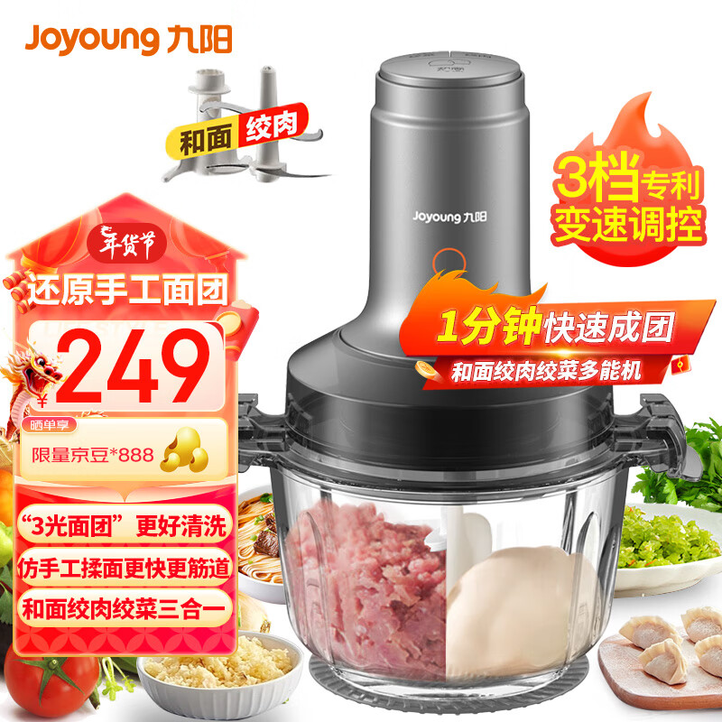 九阳(Joyoung)绞肉机家用电动多功能 1分钟快速成团绞肉绞菜机料理三合一 切菜绞馅搅面碎肉机S20-LA906价格:249.00元!