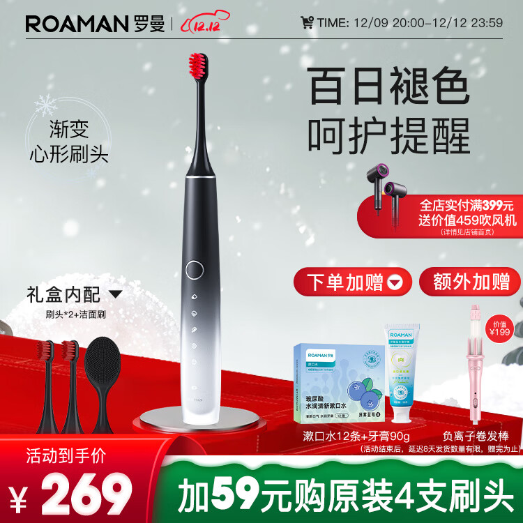 罗曼(ROAMAN)电动牙刷成人情侣套装男女智能声波电动牙刷软毛洁面 T40小心机墨雾黑价格:299.00元!
