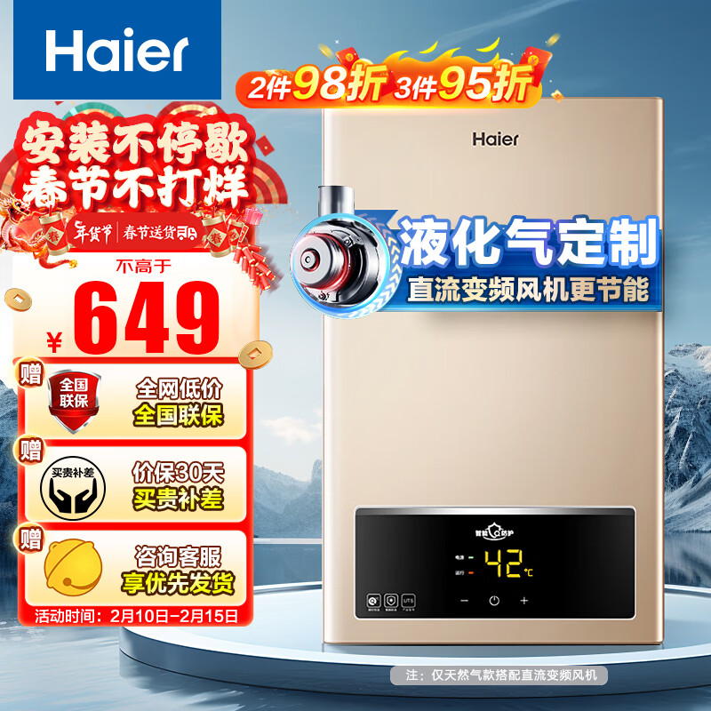 海尔(Haier)12升液化气燃气热水器 水气双调三档变升升数可调液化石油气款热水器家用家电JSQ22-12UTS(20Y)价格:649.00元!