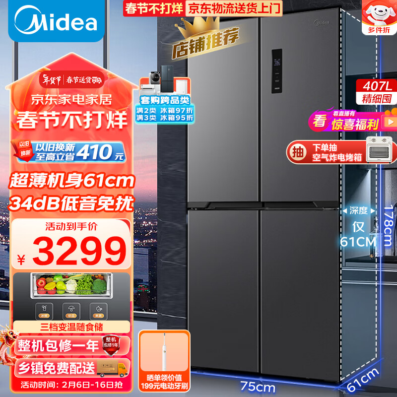美的(Midea)61厘米薄407升一级智能双变频十字对开双开门四开门家用电冰箱大容量BCD-407WSPZM(E)超薄可嵌入价格:3499.00元!