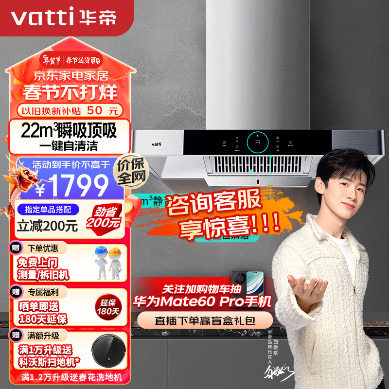 华帝(VATTI)抽油烟机 欧式抽油烟机家用静音吸油烟机 22风量大吸力挥手智控 一键自清洁 i11143价格:1799.00元!