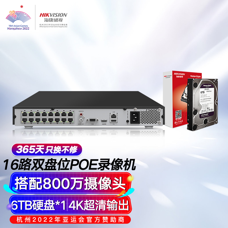 海康威视网络硬盘录像机监控16路POE网线供电满配16个摄像头带6T硬盘DS-7816N-R2/16P价格:3159.00元!