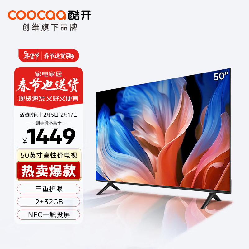 酷开创维K3 50英寸电视 2+32G内存 无边屏 智能语音 多功能投屏平板游戏液晶电视机以旧换新50P3D价格:1599.00元!