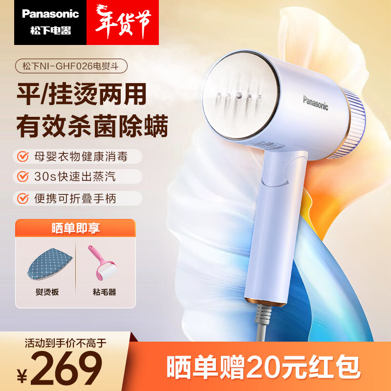 松下(Panasonic)挂烫机家用 熨斗 蒸汽挂烫机 便携 手持挂烫机 电熨斗 NI-GHF026 云雾蓝价格:299.00元!