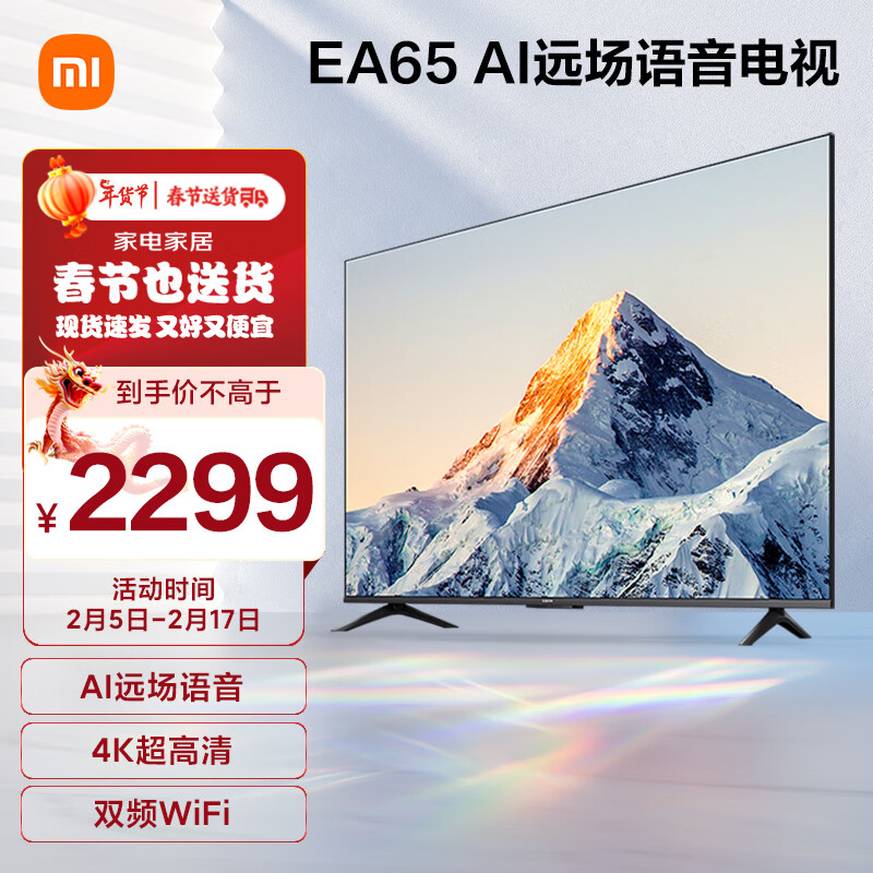 小米电视EA65 65英寸 金属屏 远场语音 逐台校准4K超高清智能教育电视机L65MA-EA以旧换新价格:2299.00元!