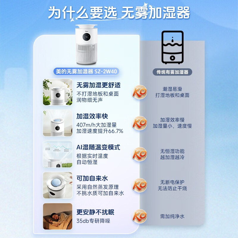 美的(Midea)无雾加湿器卧室大容量家用AI智能恒湿除菌办公室桌面婴儿母婴空气加湿净化器低噪快加湿 【无雾喷淋式蒸发】SZ-2W40价格:499.00元!