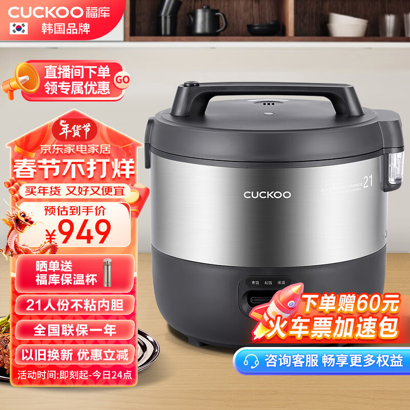福库(CUCKOO)韩国品牌商用大容量电饭煲不糊底不粘锅 学校食堂饭店餐厅大电饭锅10L年货21人份CR-2110B价格:949.00元!