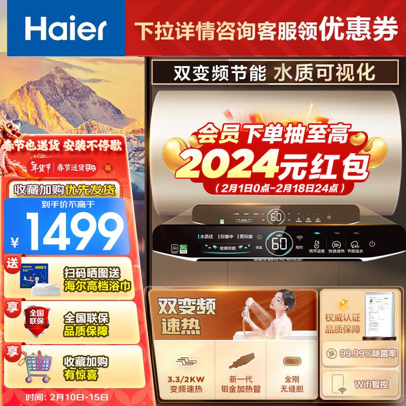 海尔(Haier)80升家用电热水器3300W变频速热一级能效水质可视金刚无缝胆WIFI智控 EC8002-JT3U1 京东小家价格:1499.00元!