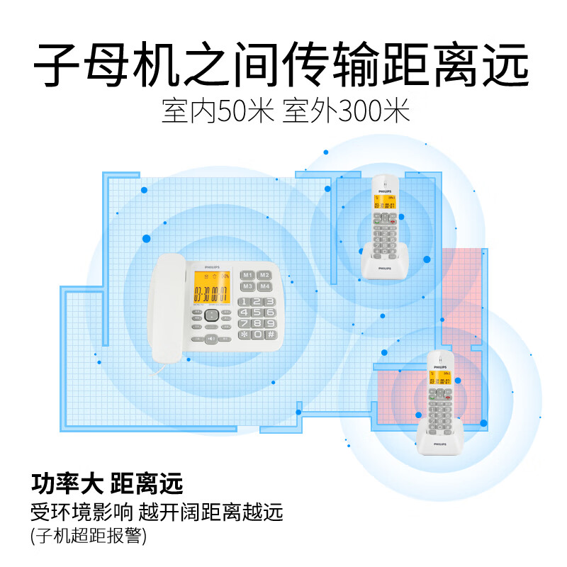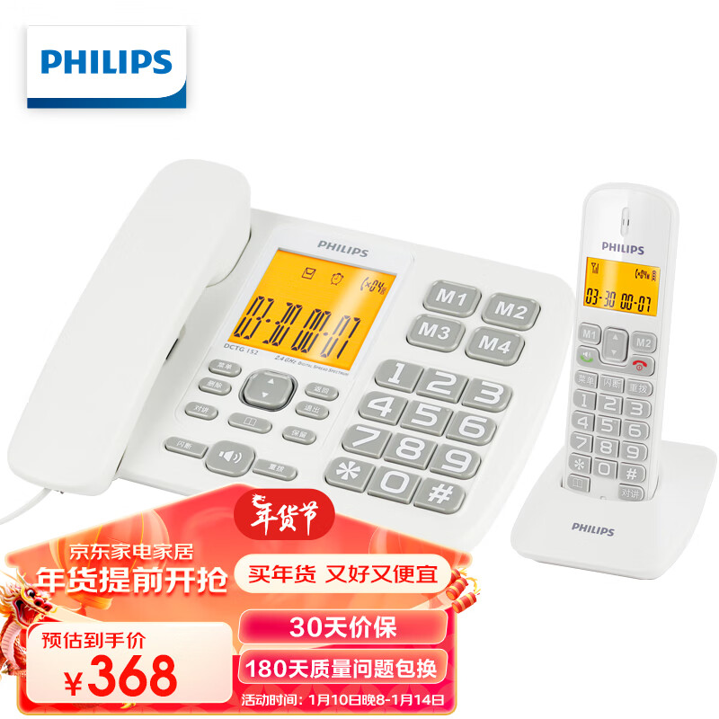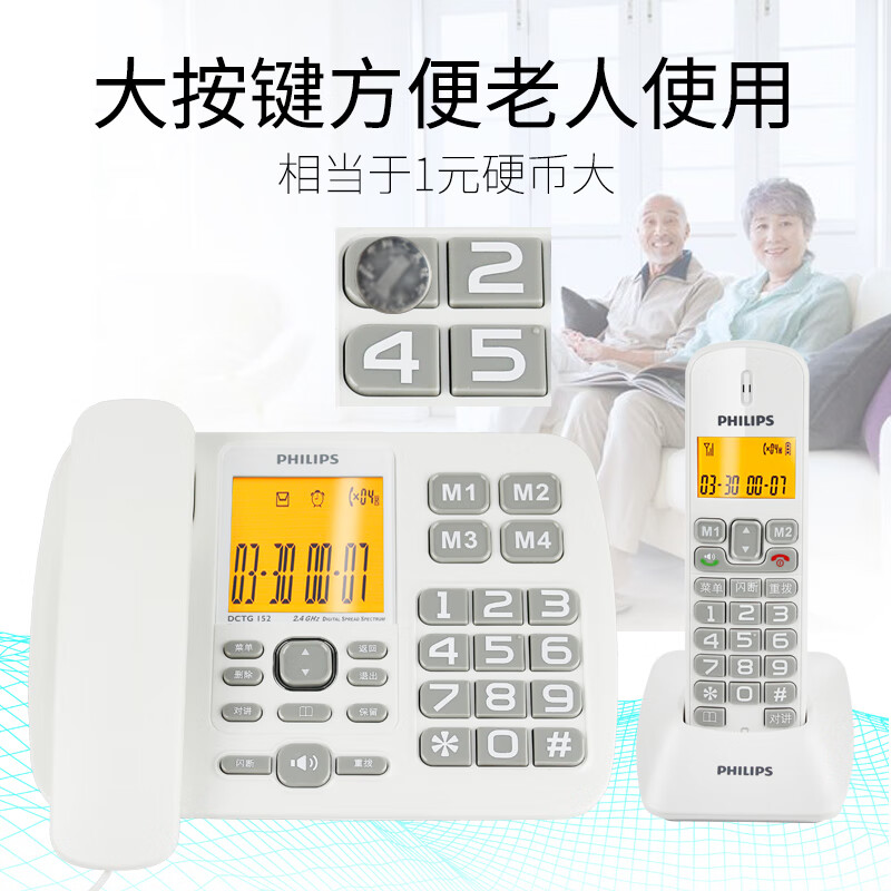 飞利浦(PHILIPS)无绳电话机 无线座机 子母机 办公家用 一键拨号 内部对讲DCTG152一拖一 (白色)价格:368.00元!
