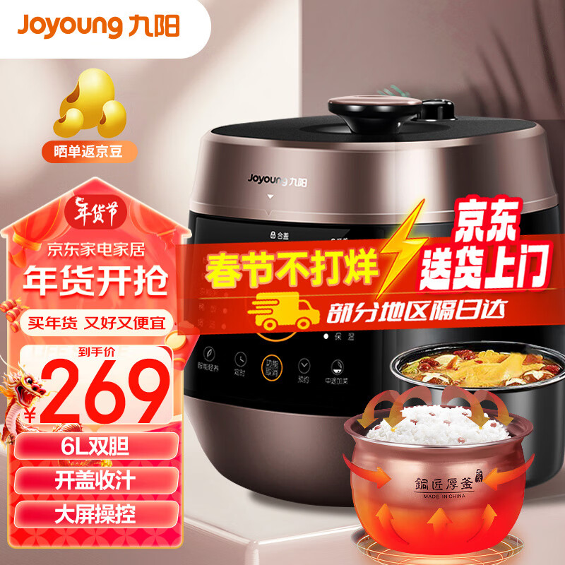 九阳(Joyoung)智能家用6升电锅煲铜匠大火一锅双胆大屏一键操作开盖营养煮年货送长辈送老人Y-60C91价格:299.00元!