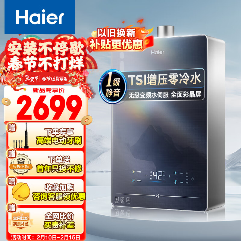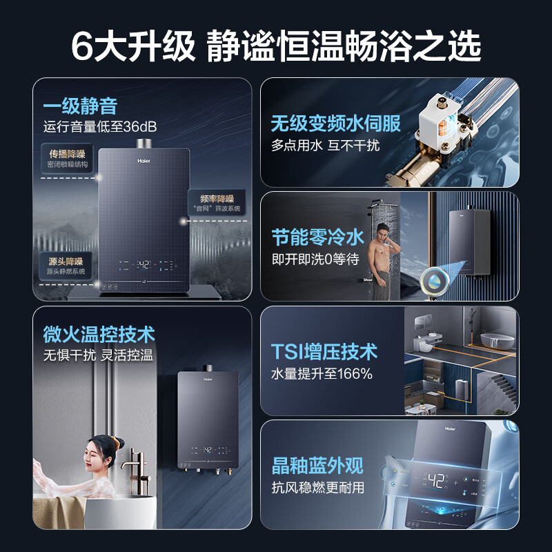 海尔(Haier)16升燃气热水器天然气 TSI增压零冷水 无级变频水伺服 一级静音 彩晶屏 JSQ30-16QR5DPQGU1价格:2899.00元!