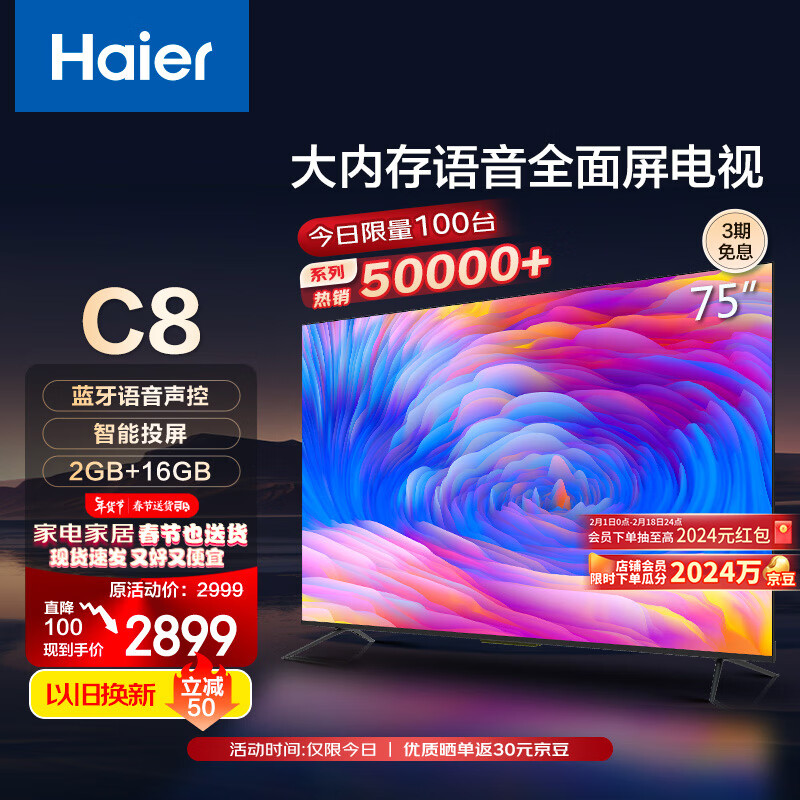 海尔(Haier)LU75C8 75英寸4K屏幕智能音画质客厅平板液晶电视机家用彩电AI远场语音2+16G以旧换新85价格:3199.00元!