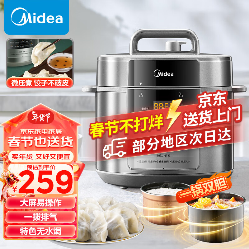 美的(Midea)饺子王系列 电锅5L家用全自动智能预约无水焗易清洁双胆大屏多功能高压锅MY-E5910(2-10人)价格:289.00元!