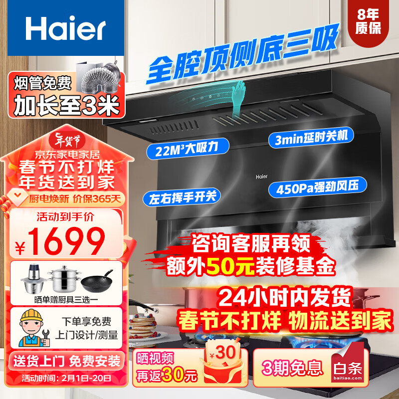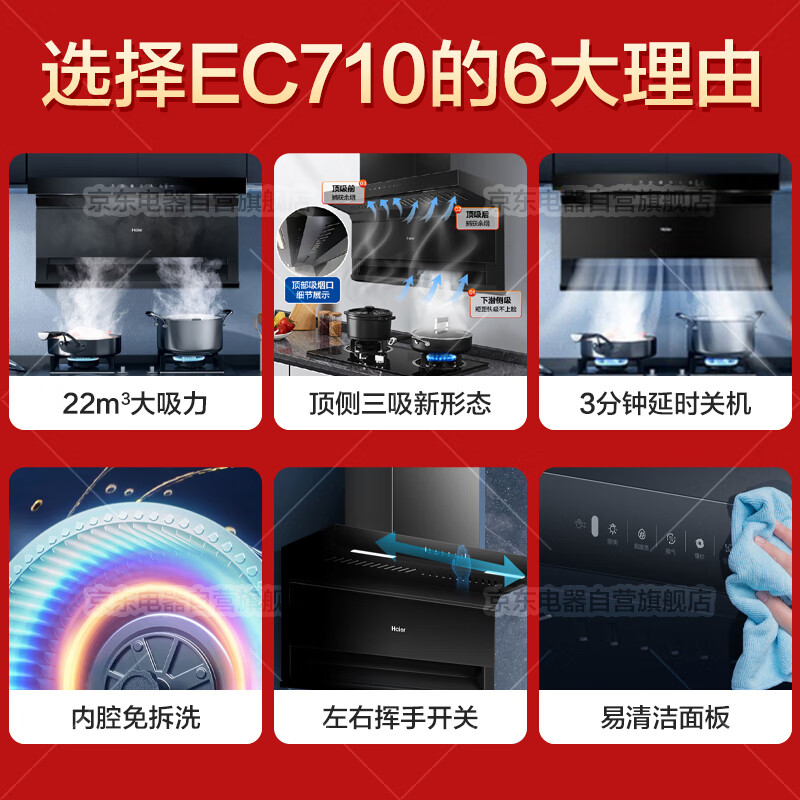 海尔(Haier)油烟机 挥手智控顶侧双吸抽油烟机 家用7字型450pa 22立方大吸力大尺寸油烟机CXW-258-EC710[家电]价格:1899.00元!