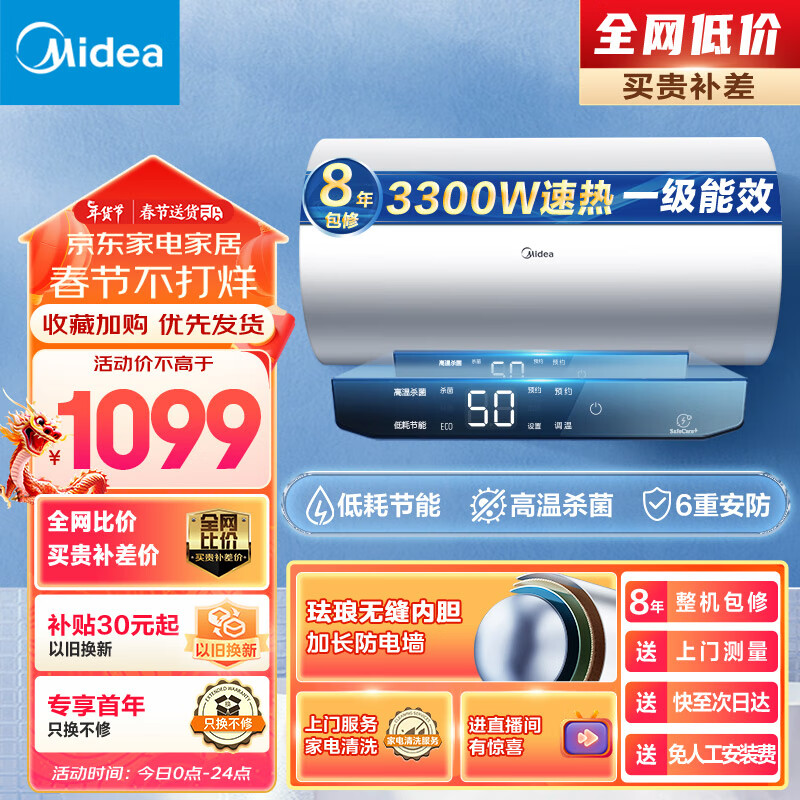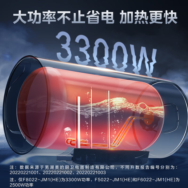 美的(Midea)热水器家用3300W速热一级能效ECO节能72小时低耗保温6重安防80升大水量电热水器F8022-JM1(HE)价格:1098.00元!