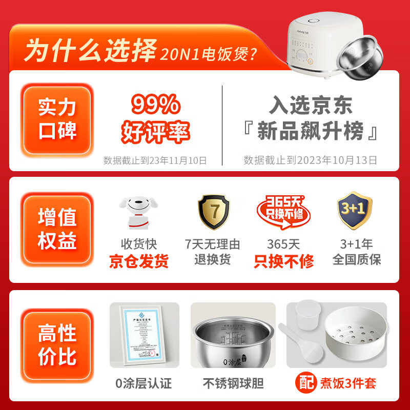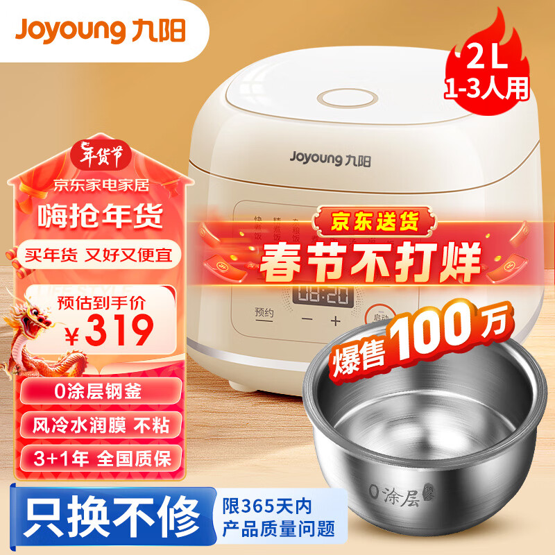 九阳(Joyoung)电饭煲1-3人小型迷你0涂层不锈钢不粘家用2L电饭锅20N1价格:319.00元!