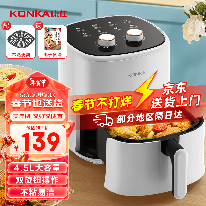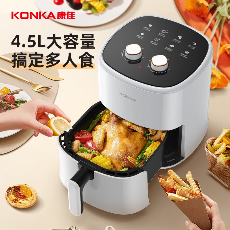 康佳(KONKA)空气炸锅 烤肉锅 家用多功能 低脂 煎炸空烤电炸锅 耐磨不粘易清洁 4.5L大容量 KKZG-4007-W(B)价格:139.00元!