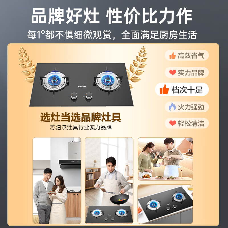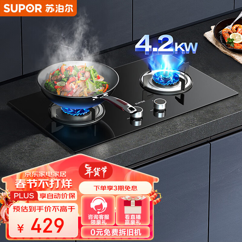 苏泊尔(SUPOR)燃气灶液化气灶 双眼灶大火力4.2kW旋火 家用台式嵌入式两用灶 黑晶面板钢化玻璃 DB07液化气价格:429.00元!