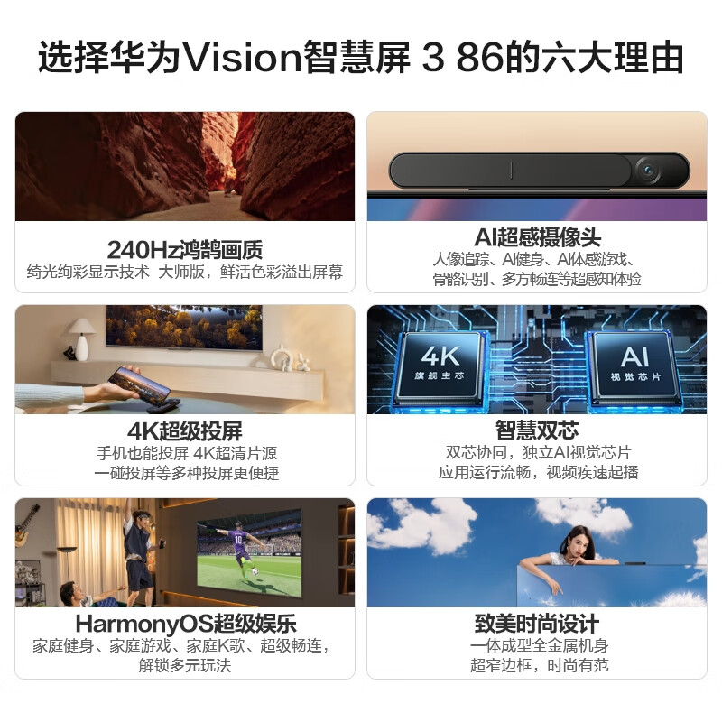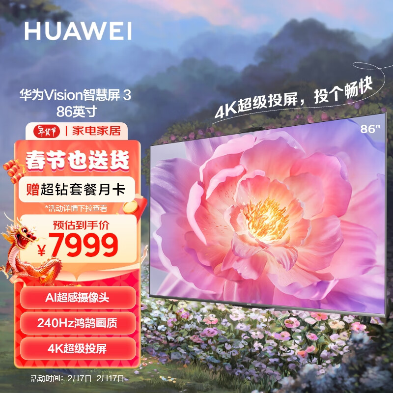 华为Vision智慧屏 3 86英寸 4K超级投屏AI摄像头 240Hz屏超高清液晶超薄护眼电视机85寸HD86QINA价格:7999.00元!