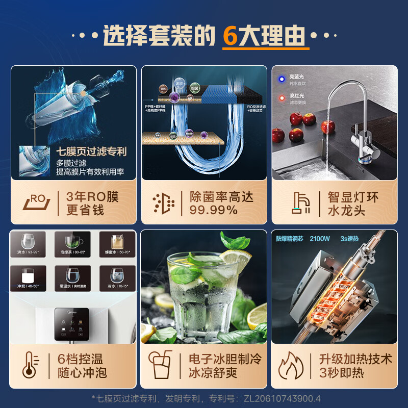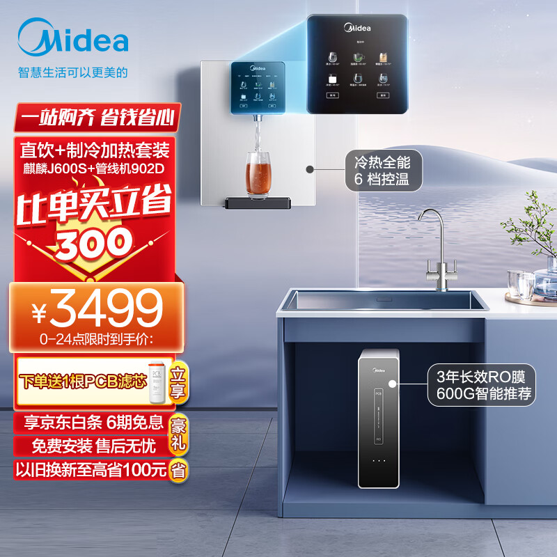 美的(Midea)直饮冷热净水器套装【麒麟J600S+管线机902D】厨下RO反渗透 家用壁挂式即热一体净饮机价格:3499.00元!