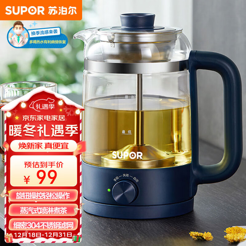 苏泊尔(SUPOR) 养生壶煮茶器煮茶壶电水壶热水壶烧水壶电热水壶迷你玻璃花茶壶黑茶 SW-10C06价格:99.00元!