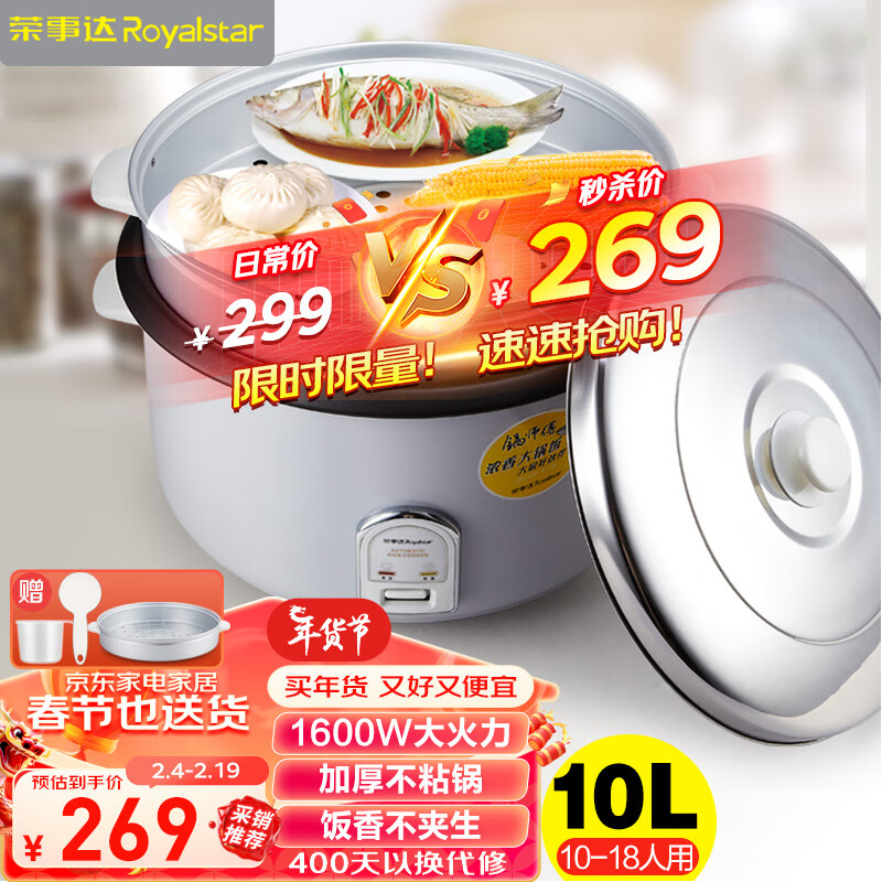 荣事达(Royalstar)商用电饭煲电饭锅传统老式酒店食堂饭店商用10L大容量带蒸笼RZ-100B价格:299.00元!