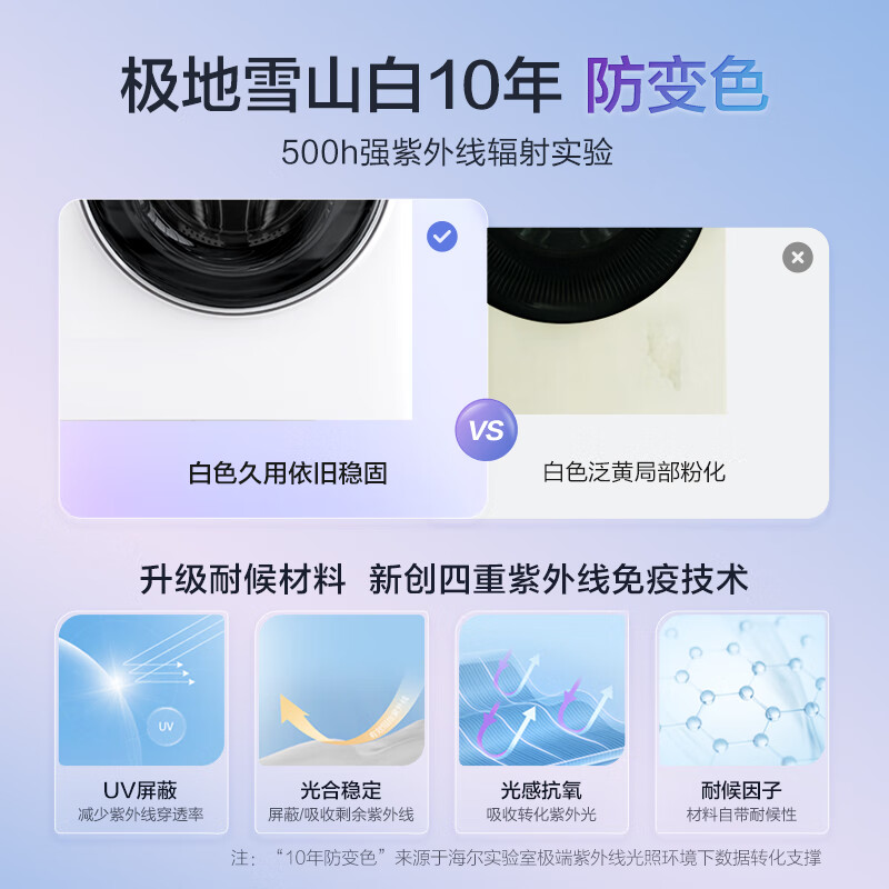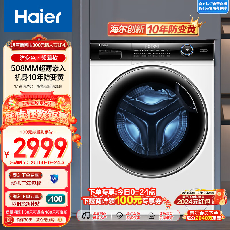 海尔(Haier)超薄滚筒洗衣机全自动 10公斤大容量 10年防变色 525mm大筒径 健康除菌螨EG100MATESL3W价格:2999.00元!