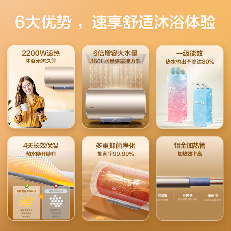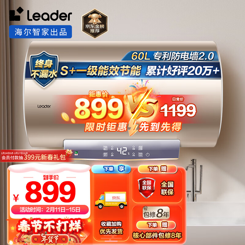 海尔智家出品Leader 60升电热水器家用2200W 一级能效节能 LEC6001-LD5金【以旧换新】价格:1179.00元!