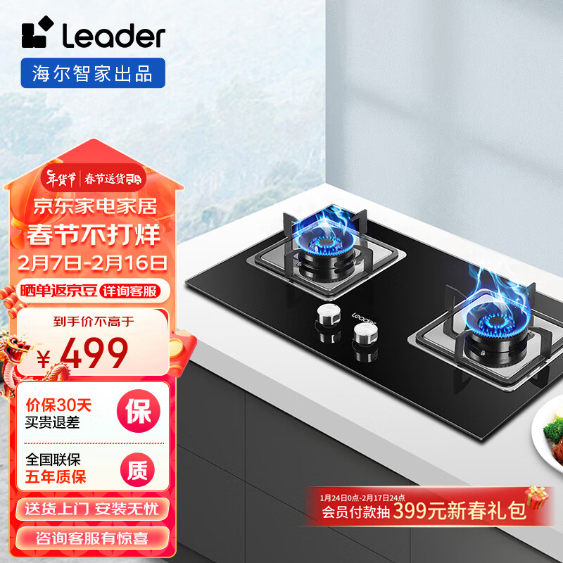 海尔(Haier)智家出品 Leader 燃气灶 天然气灶 台嵌两用家用4.5KW大火力 铜火盖天然气双头灶 JZT-QIGL2D(12T)价格:599.00元!