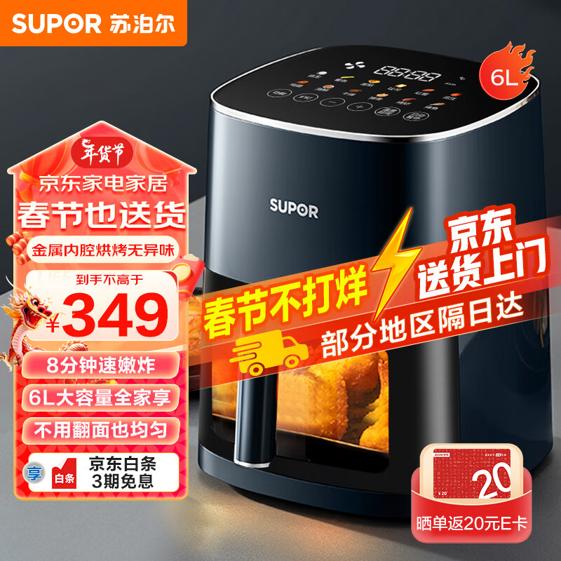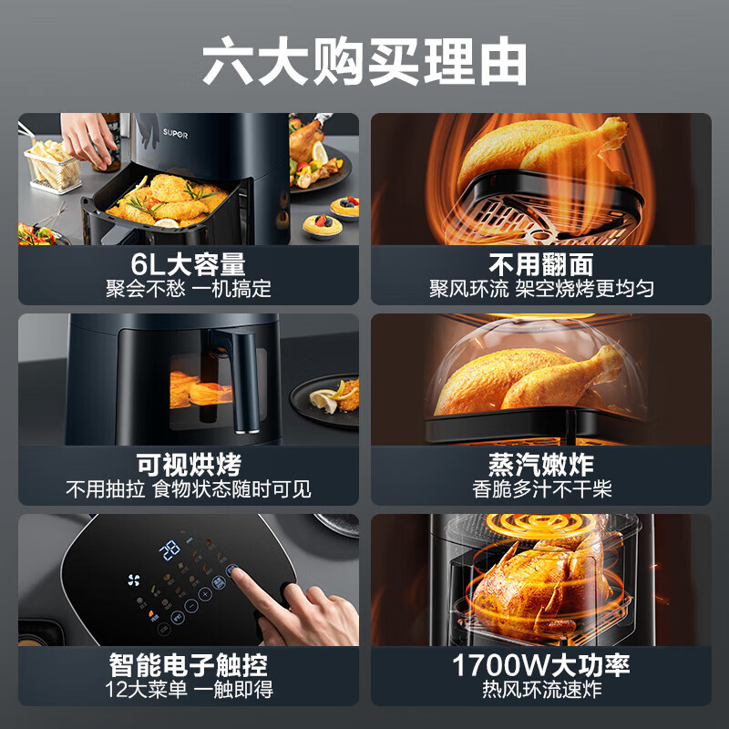 苏泊尔(SUPOR)空气炸锅家用6L大容量 可视 不用翻面 蒸汽嫩炸 大功率 液晶触控智能多功能电炸锅KD60D830价格:349.00元!