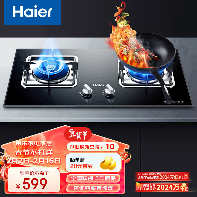 海尔(Haier)燃气灶天然气灶双灶 一级能效 4.5kw聚能火 台嵌两用熄火保护 煤气灶以旧换新QE5B0(天然气)价格:699.00元!