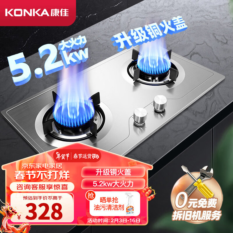 康佳(KONKA)燃气灶双灶具 5.2kW天然气双灶 家用大火力台式/嵌入式不锈钢灶台 JZT-G420Y(天然气)价格:328.00元!