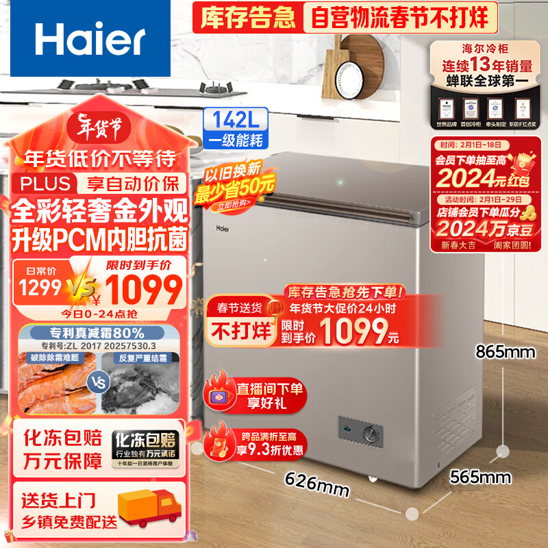 海尔(Haier)142升低霜小冰柜家用商用 冷藏柜冷冻柜冰柜小型租房用小冰箱小型冷柜BC/BD-142GHPCD 以旧换新价格:1139.00元!
