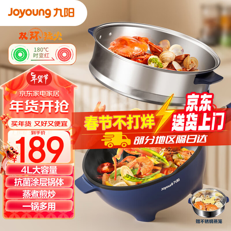 九阳(Joyoung)2200W电炒锅电煮锅电火锅电蒸锅家用电锅4L多用途配蒸笼年货送长辈送老人GC50S价格:186.00元!