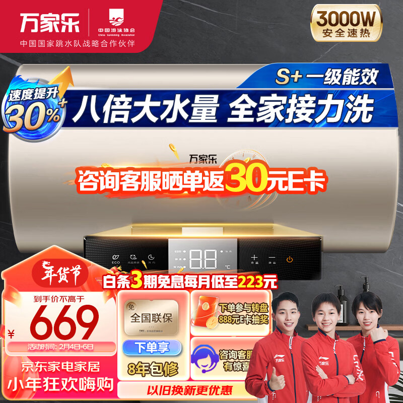 万家乐50升电热水器3000W速热大水量 一级能效 双重防电 高温杀菌 搪瓷内胆 香槟金D50-FY2价格:669.00元!