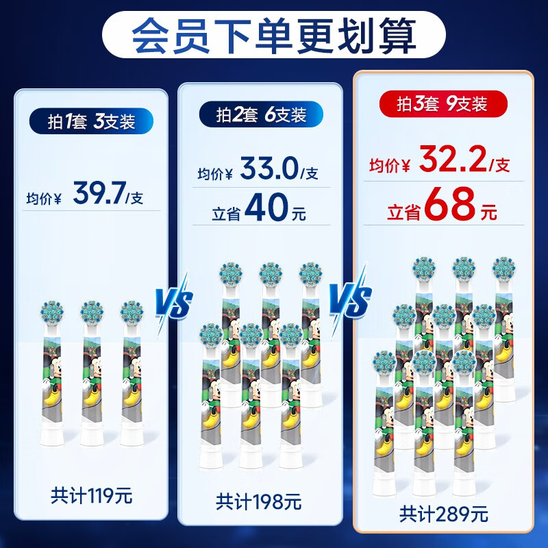欧乐B儿童电动牙刷头3支装适用D103KD100KPro1kids米奇图案EB10/EB10S-3K标准型软毛(图案包装随机发)价格:119.00元!