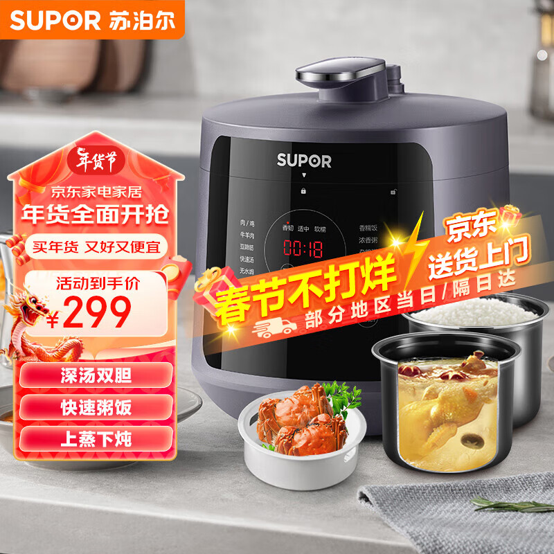 苏泊尔(SUPOR)深汤系列电锅5L家用全自动智能预约配蒸笼开盖火锅触控面板SY-50YC8011双胆电饭煲高压锅3-6人价格:369.00元!