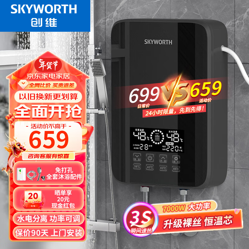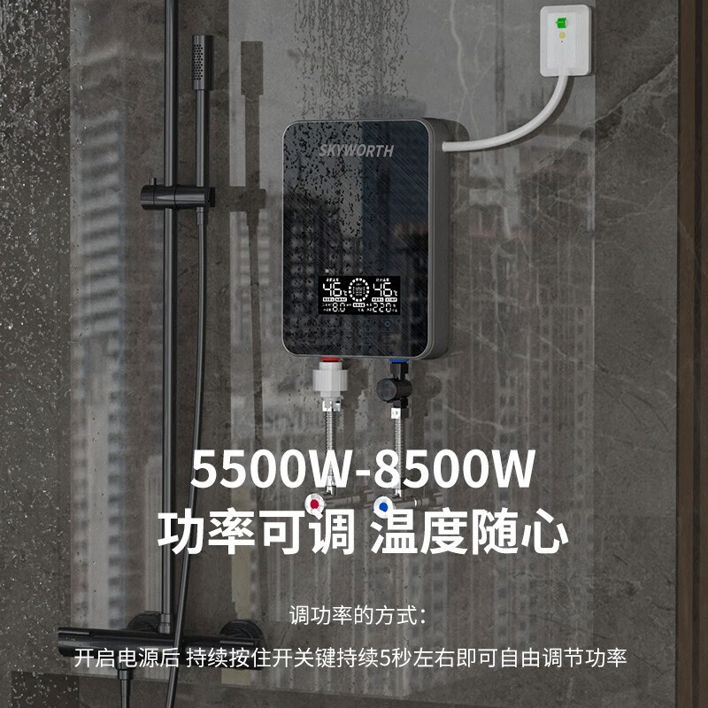 创维(Skyworth)即热式电热水器 【免费上门安装】速热式家用节能变频恒温过水热洗澡机多功率可调D877拉丝黑8500W价格:669.00元!