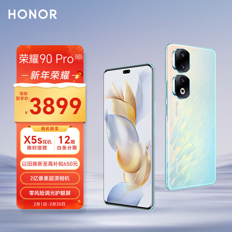 荣耀90 Pro 2亿像素超清相机 零风险调光护眼屏 5000mAh轻薄长续航 16GB+512GB 冰羽蓝 5G价格:3899.00元!