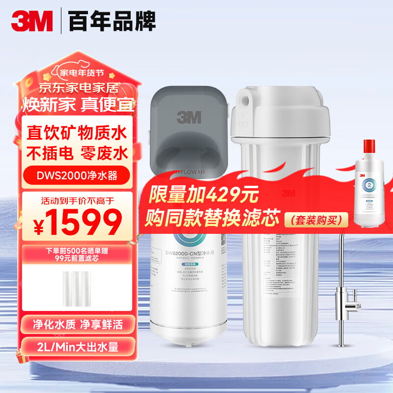 3M净水器家用净水机矿物质0废水直饮厨下2L/分大流量600G过滤器 DWS2000 CN价格:1629.00元!