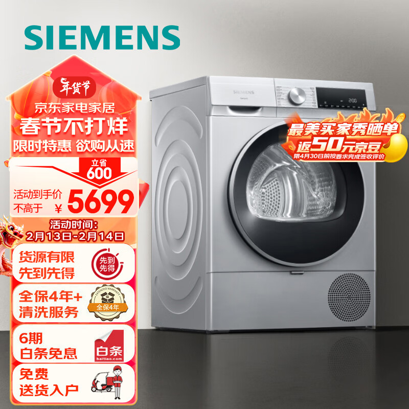 西门子(SIEMENS)iQ300 烘干机家用 10公斤热泵干衣机 除菌除螨 多维立体烘干 蚕丝柔护 羽绒烘 D80W价格:6299.00元!